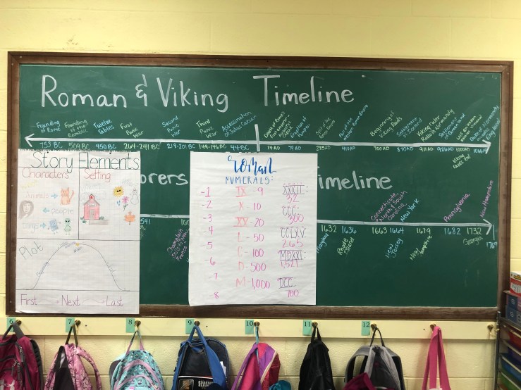 A timeline showing the history of Ancient Rome and the Vikings helps third graders memorize important dates.