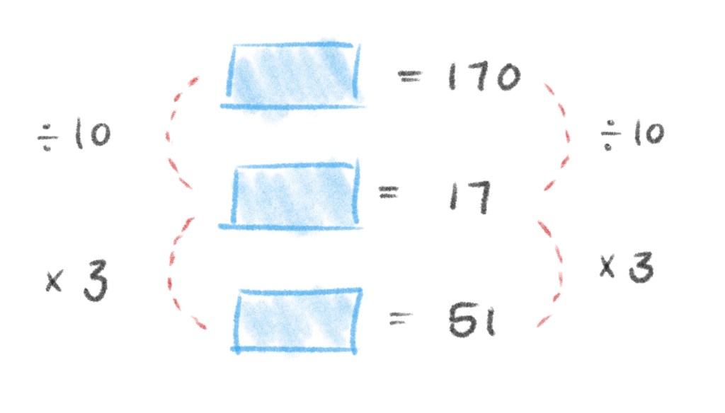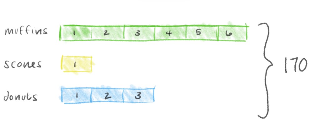 Let’s look at what we’ve got. We’ve drawn a total of 10 equally sized bars up there, and our bracket shows us that all of those together equal 170 pastries.