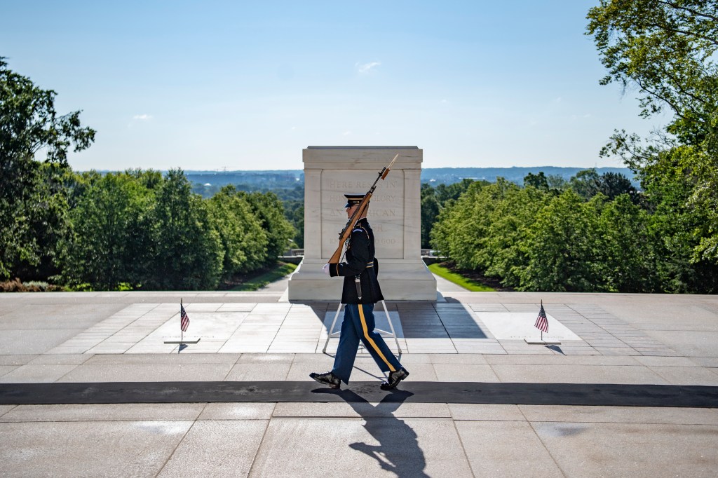 The uniform of the lone Sentinel pacing continuously in front of the Tomb of the Unknown Soldier was striking for another reason. It was not the garb of just any soldier. The uniform is a dark, regal blue with sharp, gold shoulder straps and piping on the pant legs. Crisp, white gloves on each hand and perfectly polished black boots on each foot. On his head, an immaculate blue cap with gold accents to match the uniform and in his hands a rifle so clean that sunlight glints off of metal muzzle and wooden stock alike. The uniform, paired with the solemn, stoic demeanor of the guard pacing in front of it conveys the reverence and seriousness demanded by such a sacred place of honor and remembrance.